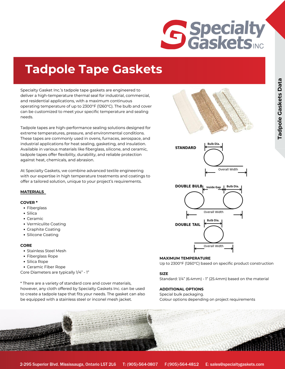 Explore Specialty Gaskets’ premium range of high-temperature sealing solutions. Including fiberglass, ceramic, silica, and vermiculite ropes, tapes, and tadpole tapes, built to perform where conventional materials fail. Designed for industrial, HVAC, hearth, and appliance applications, these products deliver dependable performance in continuous high heat conditions.